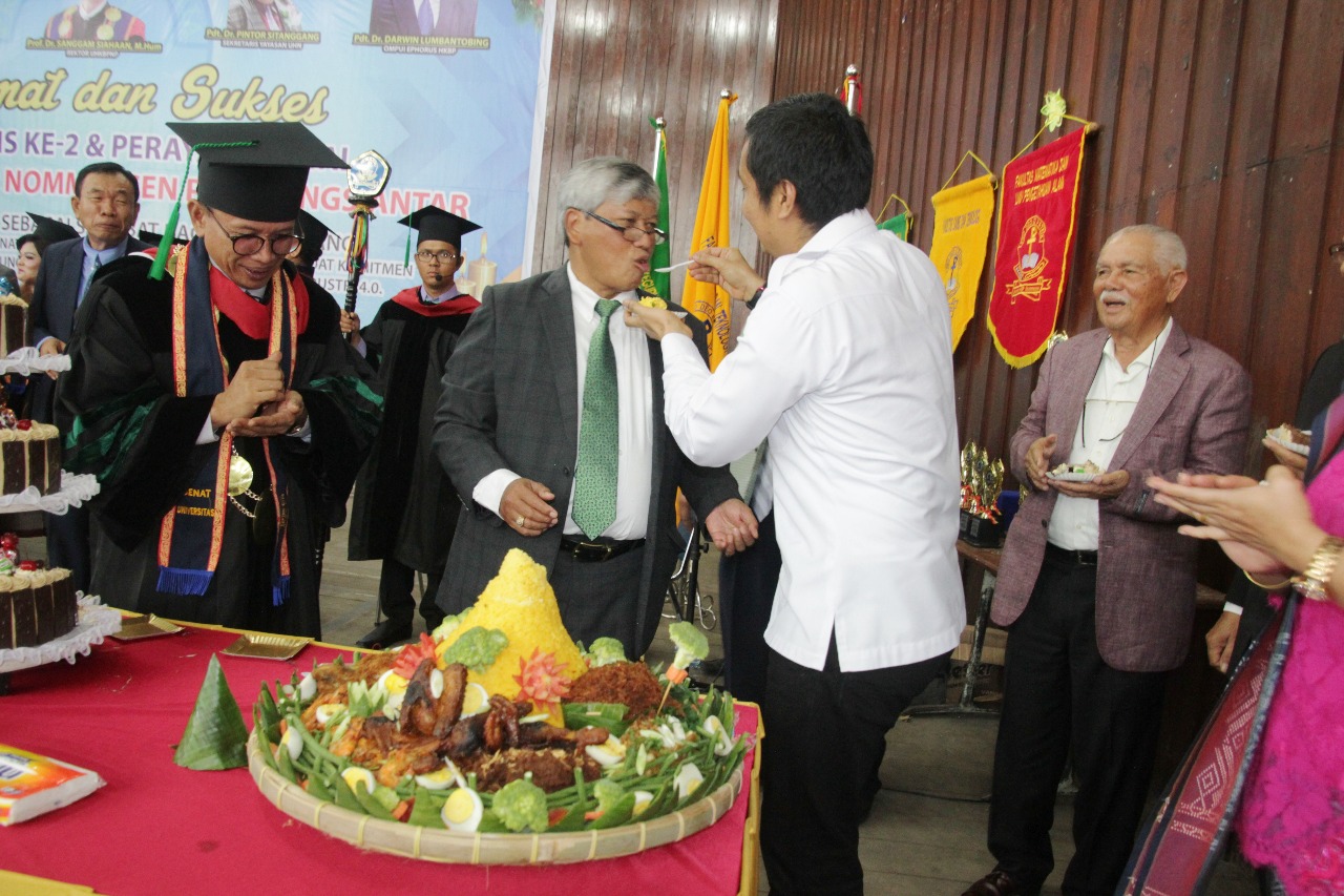 Acara puncak Dies Natalis UHNP yang berlangsung khidmat dan meriah diakhiri dengan tiup lilin sekaligus pemotongan kue dan nasi tumpeng yang dilakukan Ephorus HKBP Pdt. Dr. Darwin Lumbantobing didampingi Rektor UHNP Prof. Dr. Sanggam Siahaan M.Hum, dan Walikota Pematangsiantar H. Hefriansyah SE. MM. serta para perwakilan Forkopimda Kota Pematangsiantar, mewakili Wisudawan dan mewakili orang tua wisudawan serta mewakili undangan yang hadir. (Susan)