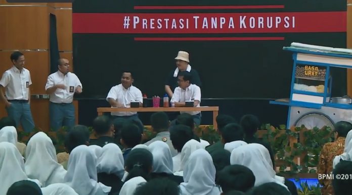 JAKARTA, MOI – Drama bertajuk #Prestasi Tanpa Korupsi, dalam memperingati hari anti korupsi sedunia ini di perankan oleh tiga Menteri Kabinet Indonesia Maju, akting mereka sangat bagus, mendidik dan menghibur para penonton termasuk Presiden Jokowi. Drama ini berlangsung di SMKN 57 Jakarta pada Senin (9/11/2019).