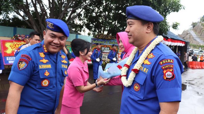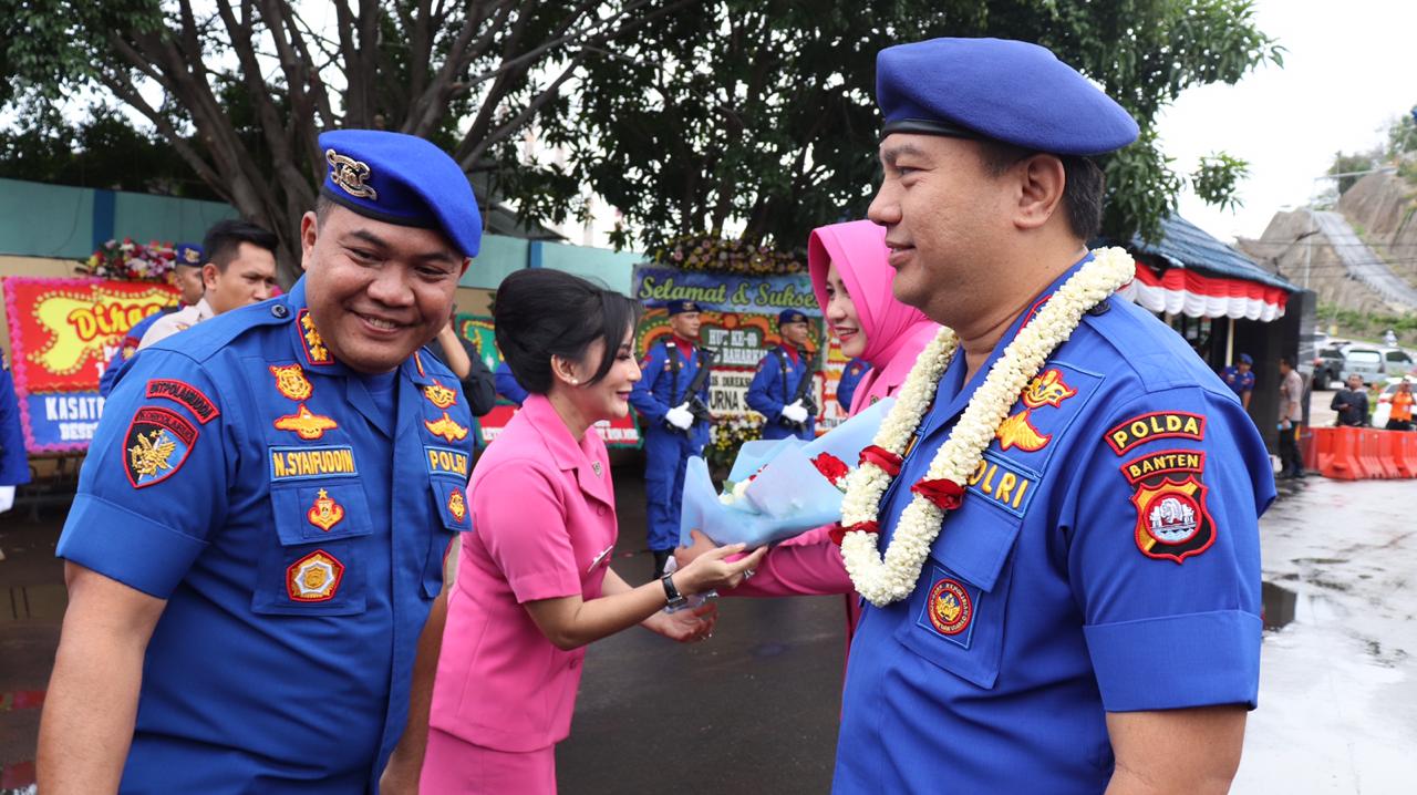 Terlihat Nampak Dirpolairud Mengalungkan karangan bunga kepada Kapolda Banten dan ketua Bhayangkari Cabang Polairud memberikan bouquet Bunga kepada Ibu ketua Bhayangkari daerah Banten