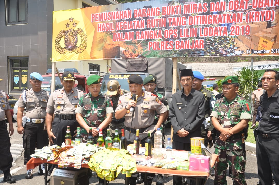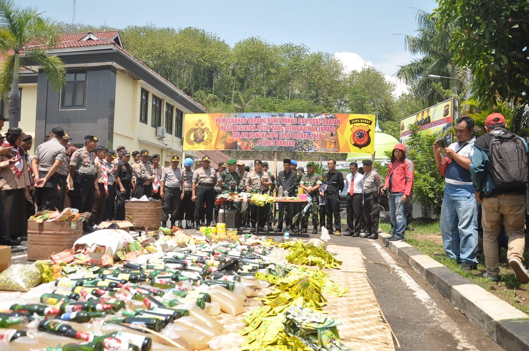 BANJAR, MOI – Setelah pelaksanaan Apel Gelar Pasukan Lilin Lodaya 2019, Polres Banjar dan Muspida Kota Banjar melaksanakan pemusnahan barang bukti hasil pengungkapan kasus yang dilaksanakan Polres Banjar. Barang bukti tersebut terdiri dari ratusan liter minuman alkohol tradisional dan ratusan botol miras pabrikan berbagai merk, serta lebih dari 500.000 butir obat palsu.
