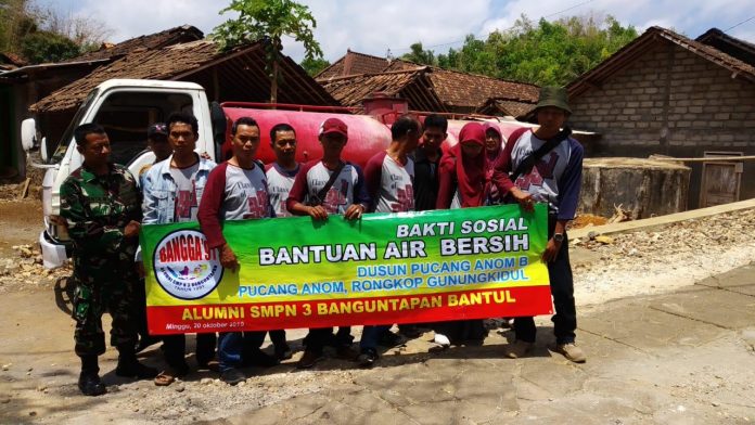 Oleh Keadaan ataupun situasi seperti itu Alumni SMPN 3 Banguntapan Bantul DIY tergerak hatinya untuk memberikan bantuan air bersih, adapun pemberian bantuan air bersih itu secara simbolis diberikan kepada Kepala Dusun Banombo Kalurahan Pucanganom Kecamatan Rongkop Kabupaten Gunung Kidul DIY Bpk Tuparto dan Pak Amin oleh Ketua Alumni SMPN3 Banguntapan Bantul DIY alumni tahun 1991 Bpk. Haryono dan Bpk Aris total bantuan sebanyak 35 tangki (Minggu, 20/10/2019)