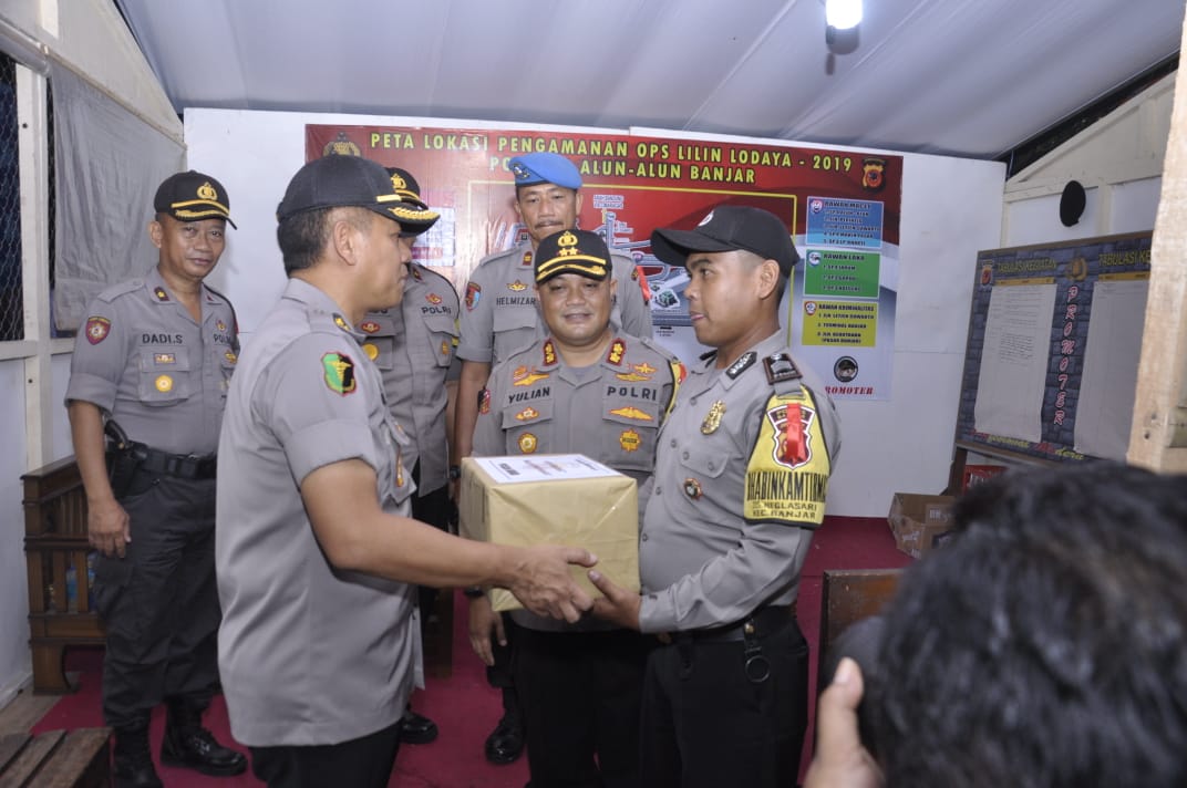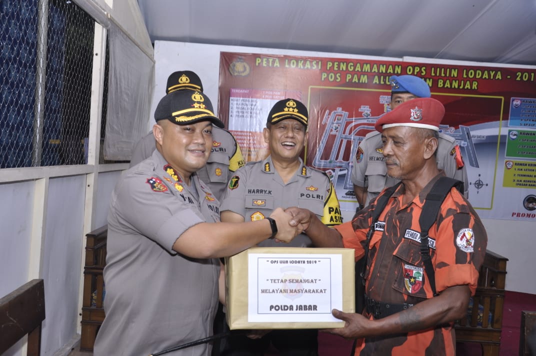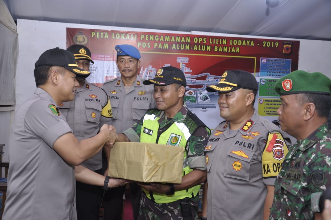 Pamenwas dan Kapolres secara simbolis memberikan bingkisan berupa makanan ringan untuk bekal saat bertugas di Pos Pam, tak hanya personil Kepolisian, namun Unsur TNI dari Kodim 0613 Ciamis dan Dinas Kesehatan, serta OKP yang ikut terlibat dalam Pos Pam tersebut diberi bingkisan oleh Kapolres Banjar dan Pamenwas.